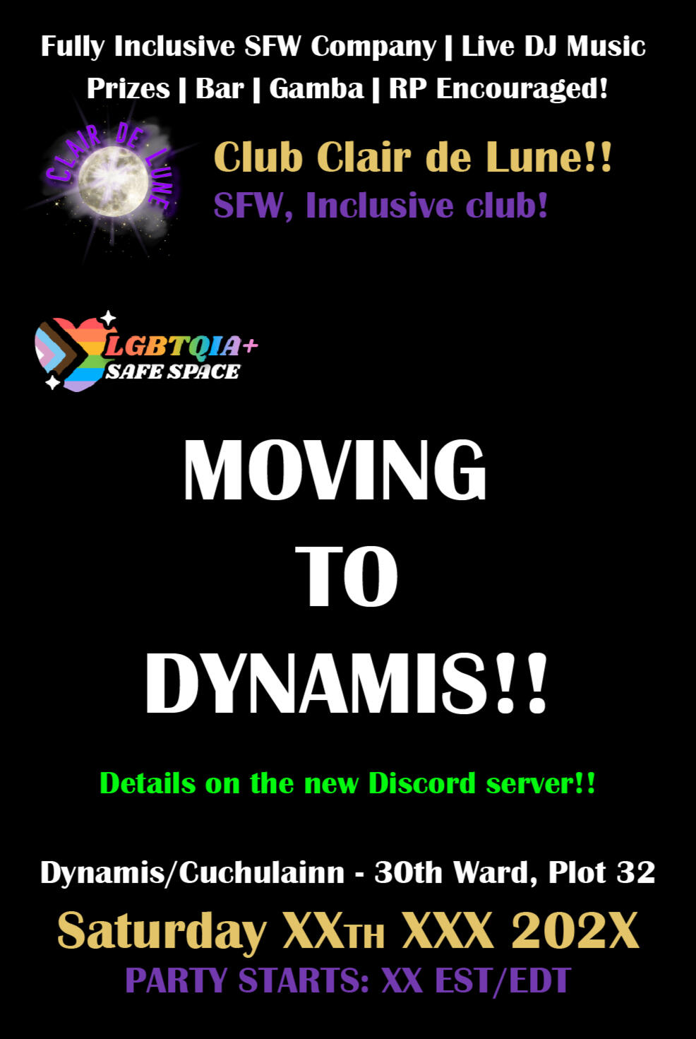 Clair de Lune has now moved it's immersive, inclusive and SFW (Mature) spin on night clubbing to the Dynamis datacenter.Club Clair de Lune proudly still sports Free Company FTW (Forging True Wonders, Materia datacenter, Sophia server) crest colours of purple/yellow/gold. It hosts a rich boldly glowing and a uniquely atmospheric moonlight focused theme.Clair de Lune (French for Moonlight) was inspired by beautiful moon lit views through out Eorzea. The name was inspired by a classic piano piece Clair de Lune by Claude Debussy.